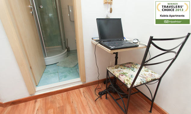 The Kaleta apartments provides fully packed with a king size bed with all the necessary accessories like blanket, pilows, designer linens,electric kettle, kitchen with utensils and a well-equipped bathroom with all modern features. The apartment is air-conditioned with laptop computer with WiFi access for unlimited high speed internet.The apt is decorated with some artwork which enhances the elegance of apartment.